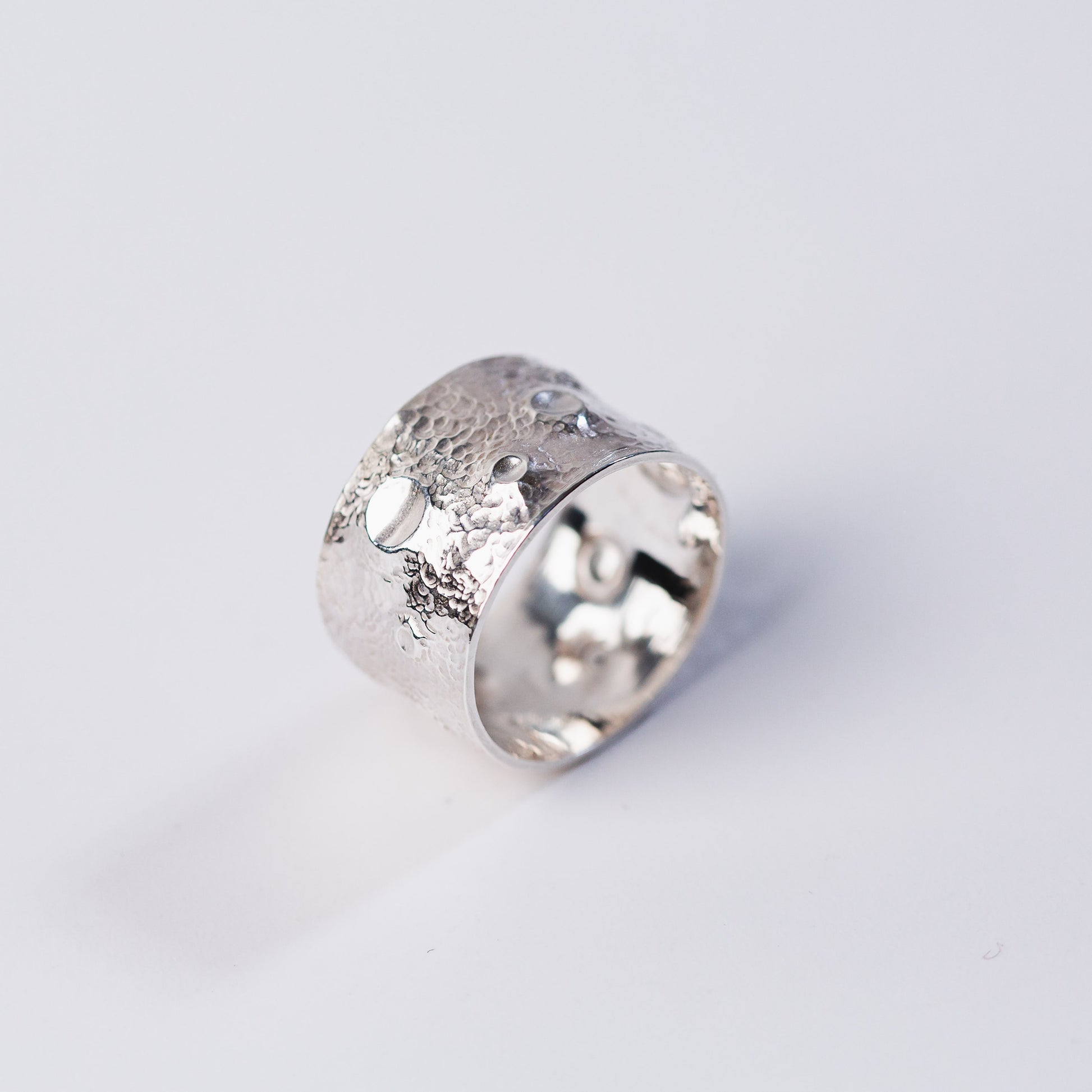 I paesaggi lunari diventano ispirazione per questa linea di gioielli realizzati con l'antica tecnica dello sbalzo e cesello. La texture, composta da crateri di diverse forme e dimensioni, varia tra un pezzo e un altro. E' per questo che ognuno di questi gioielli è considerato un pezzo unico e irripetibile.