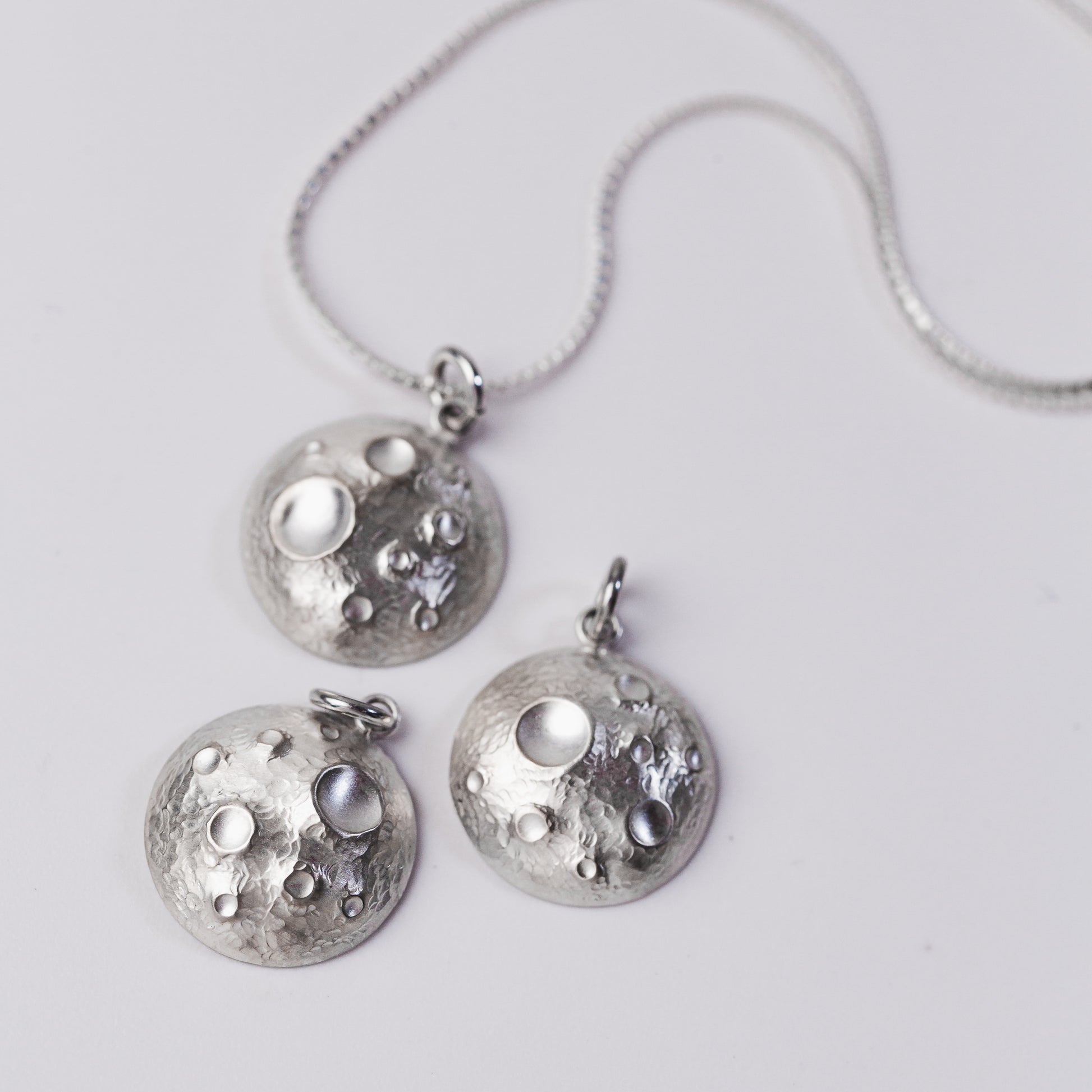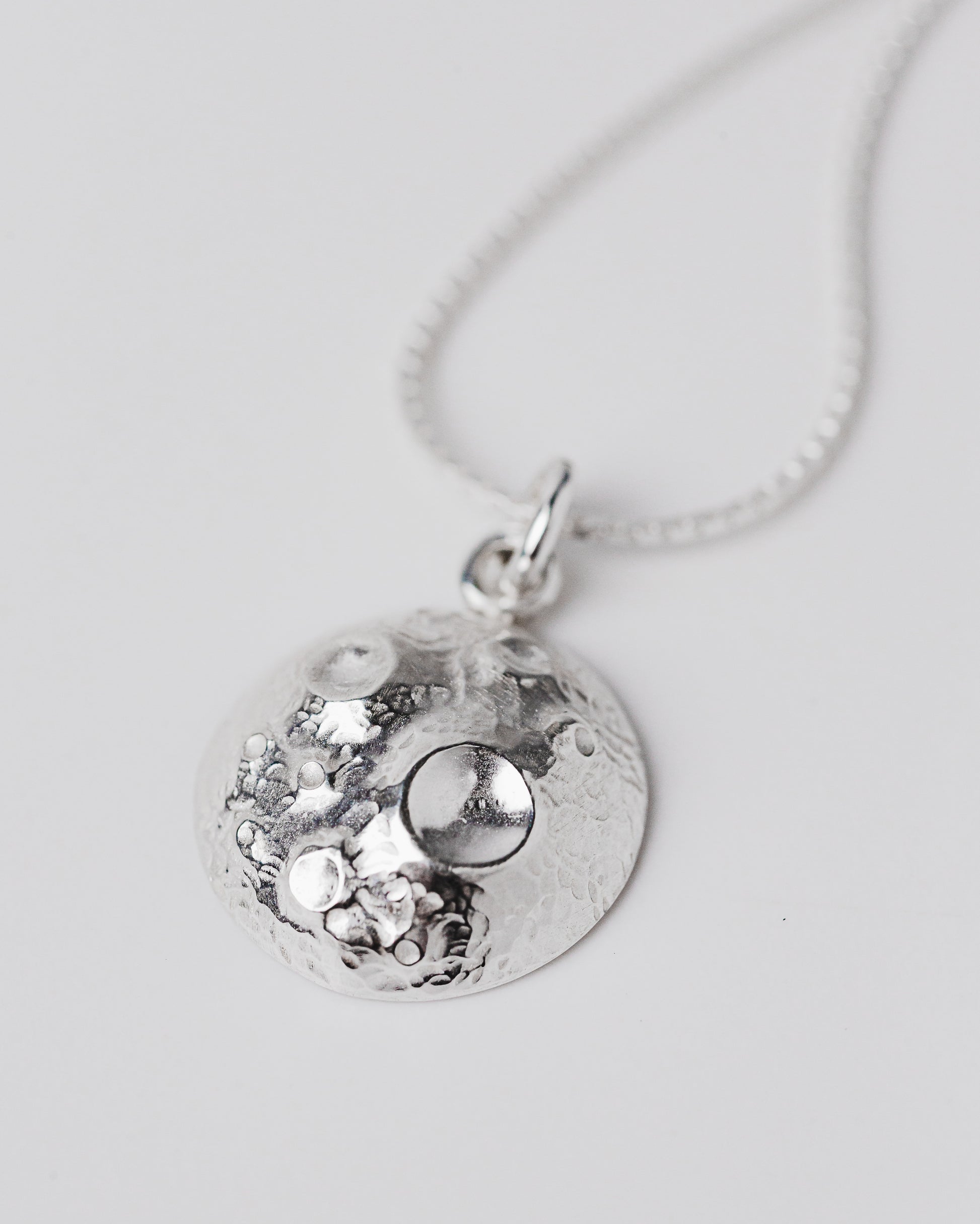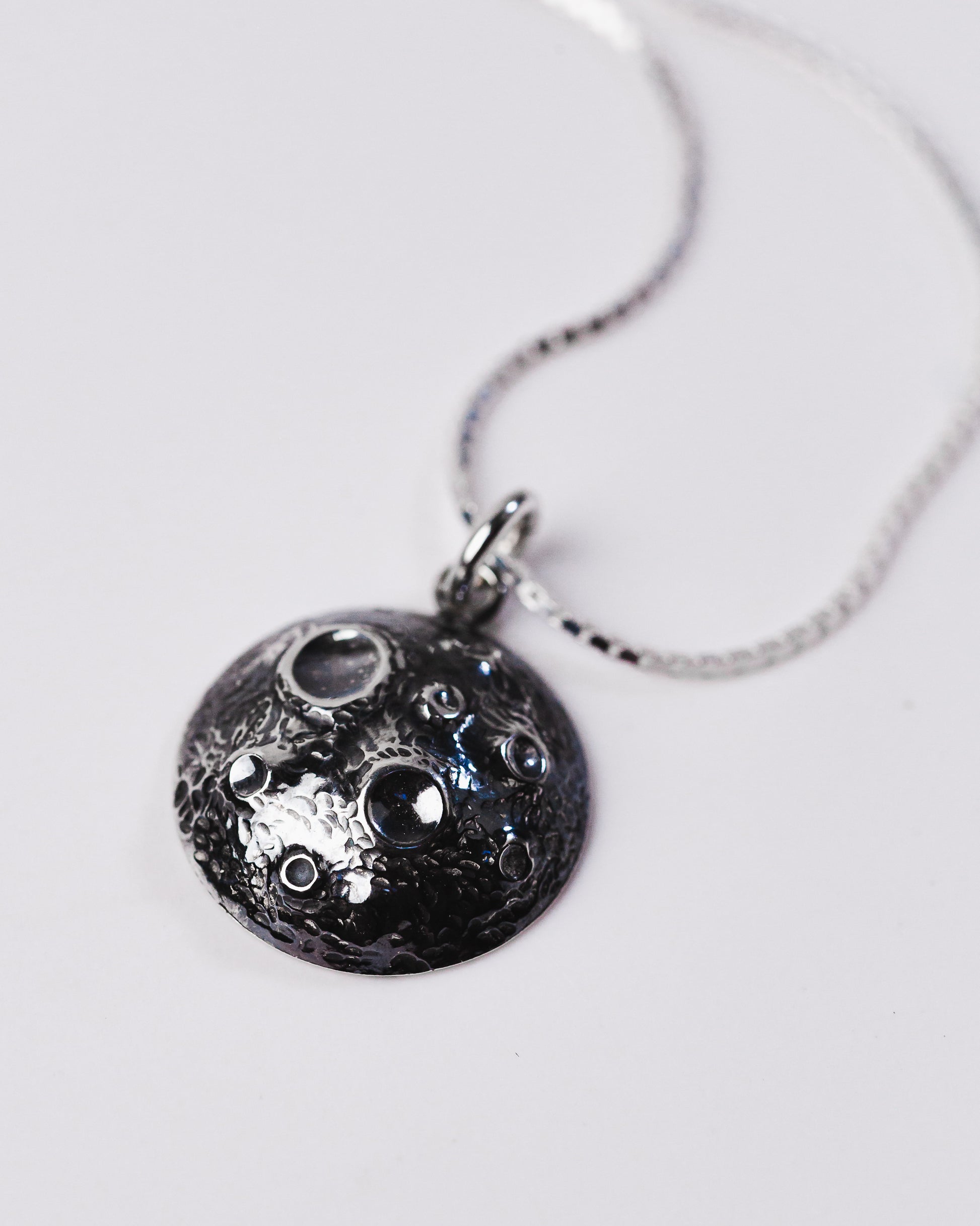 I paesaggi lunari diventano ispirazione per questa linea di gioielli realizzati con l'antica tecnica dello sbalzo e cesello. La texture, composta da crateri di diverse forme e dimensioni, varia tra un pezzo e un altro. E' per questo che ognuno di questi gioielli è considerato un pezzo unico e irripetibile.