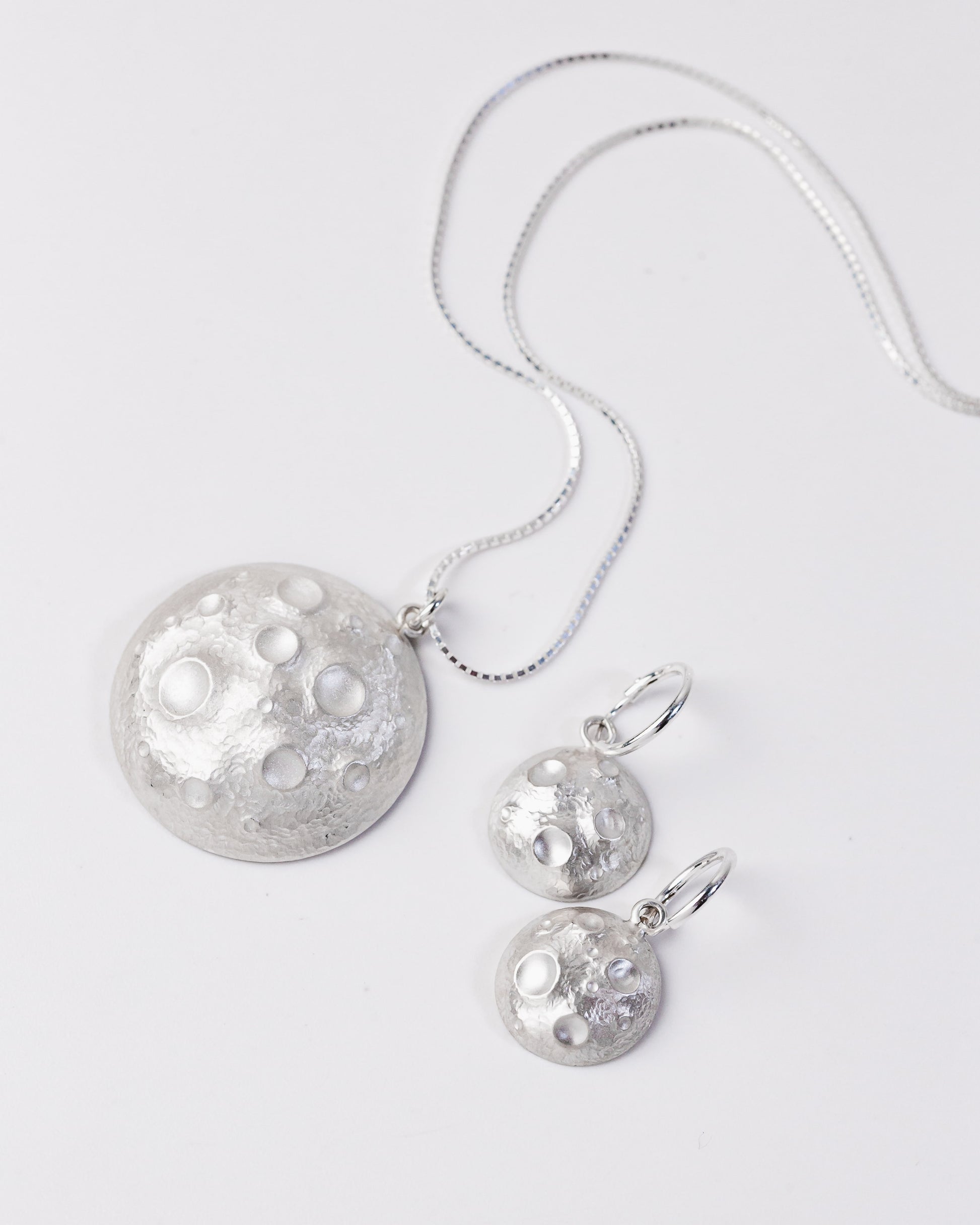 I paesaggi lunari diventano ispirazione per questa linea di gioielli realizzati con l'antica tecnica dello sbalzo e cesello. La texture, composta da crateri di diverse forme e dimensioni, varia tra un pezzo e un altro. E' per questo che ognuno di questi gioielli è considerato un pezzo unico e irripetibile.